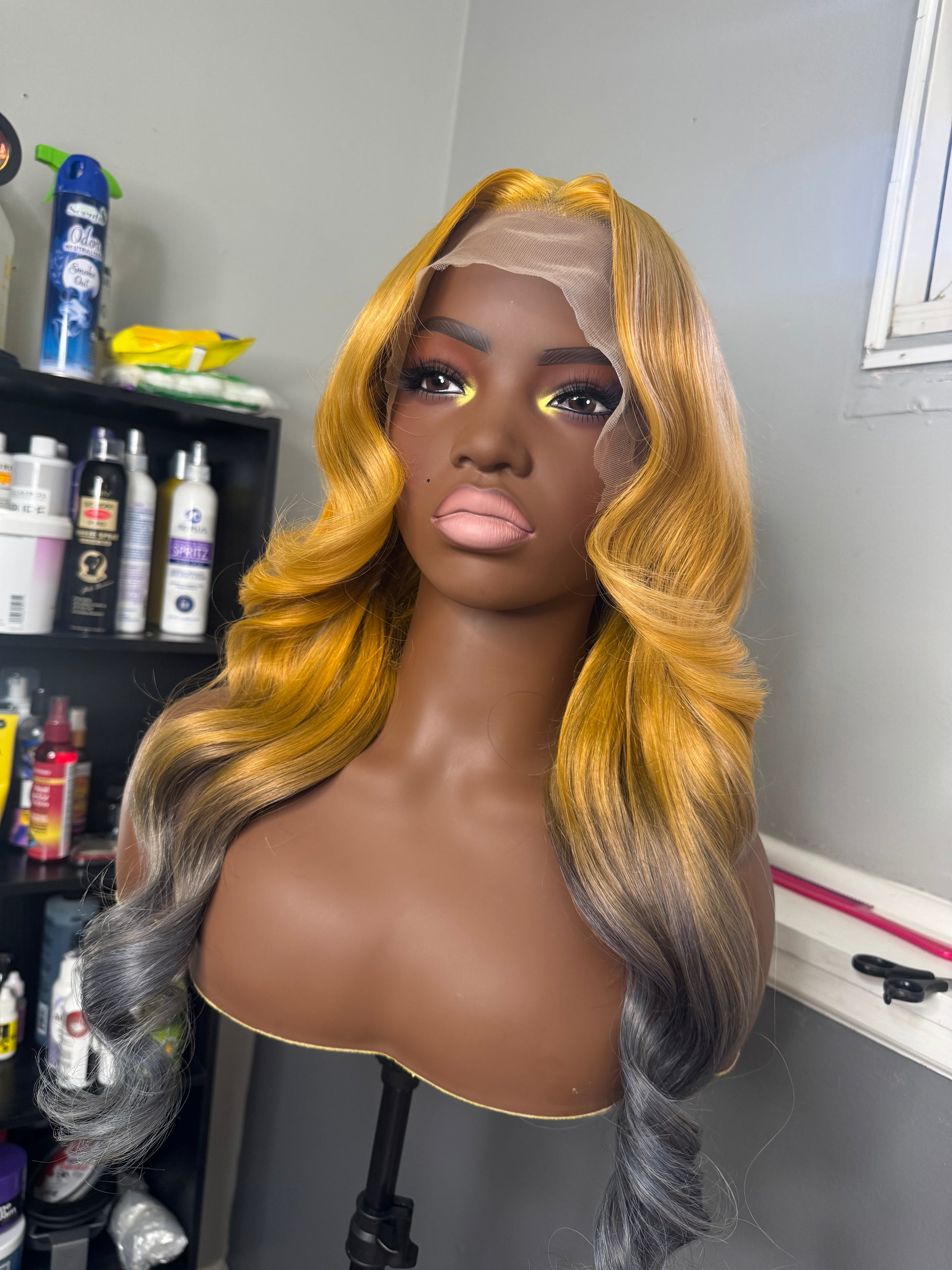 Orange spice and grey wig, 28 inch and 13x6 ready to wear unit 100% virgin unit, styled as seen on photo